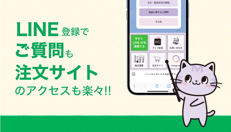 ムーランエムーランのLINE@を友だち登録いただくと、トーク画面から『注文サイト』や『サロンさま専用サイト』に楽々アクセスできるようになりました。