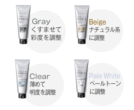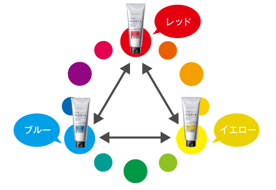 ・色の三原色(レッド、イエロー、ブルー)を使って、絵の具感覚で色を作り、そこに彩度調整のグレイとベージュ、色を薄めるクリアとホワイトでバリエーションを広げられます。